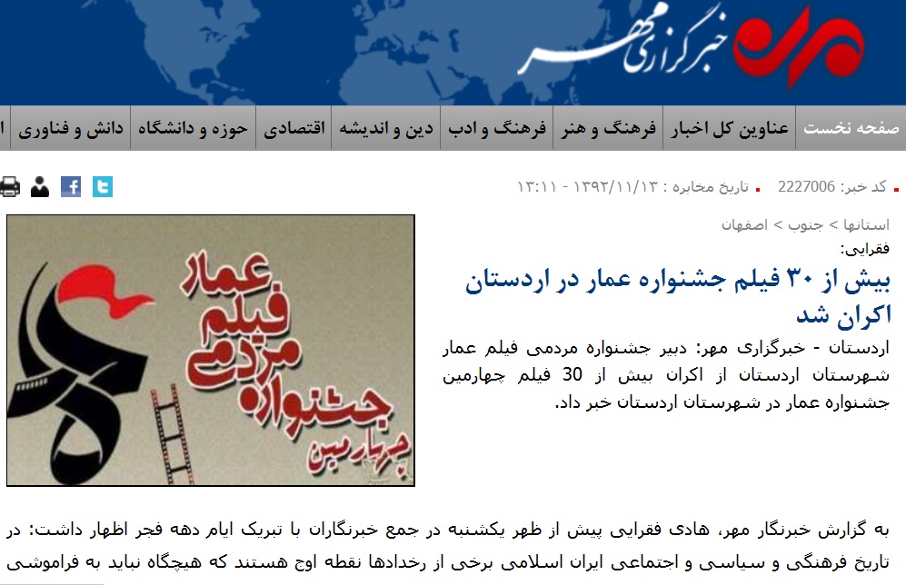 - خبرگزاری مهر: دبیر جشنواره مردمی فیلم عمار شهرستان اردستان از اکران